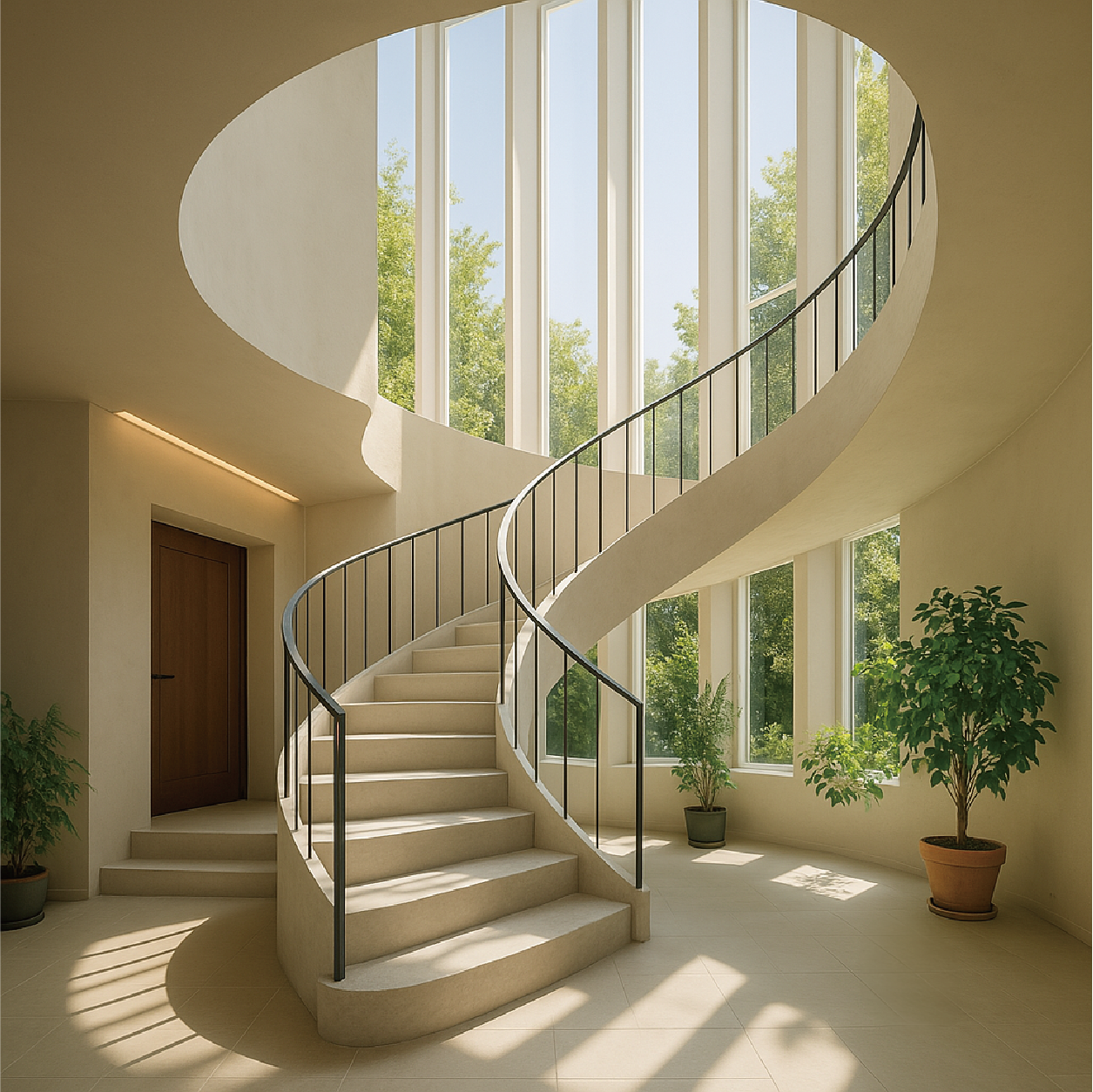 建物中央には、らせん階段。香りが舞うように緩やかな動線を描きながら、2階には主寝室と子ども部屋を完備。