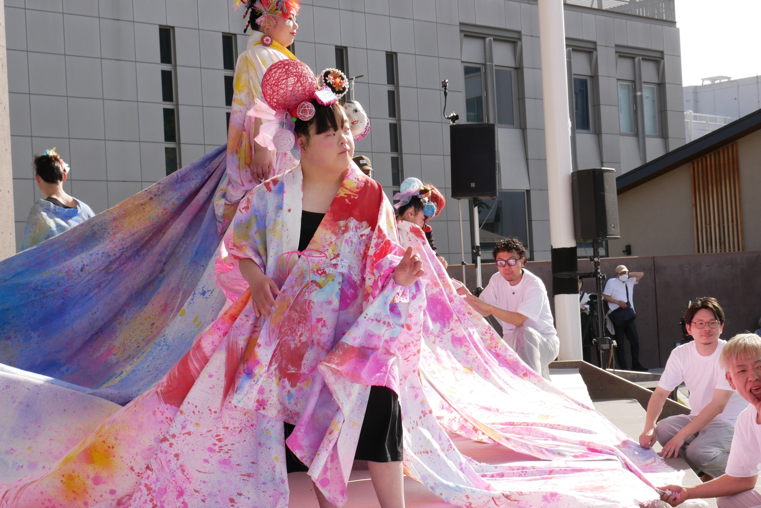 越さんがライブペイントで衣装を色鮮やかに彩ます。