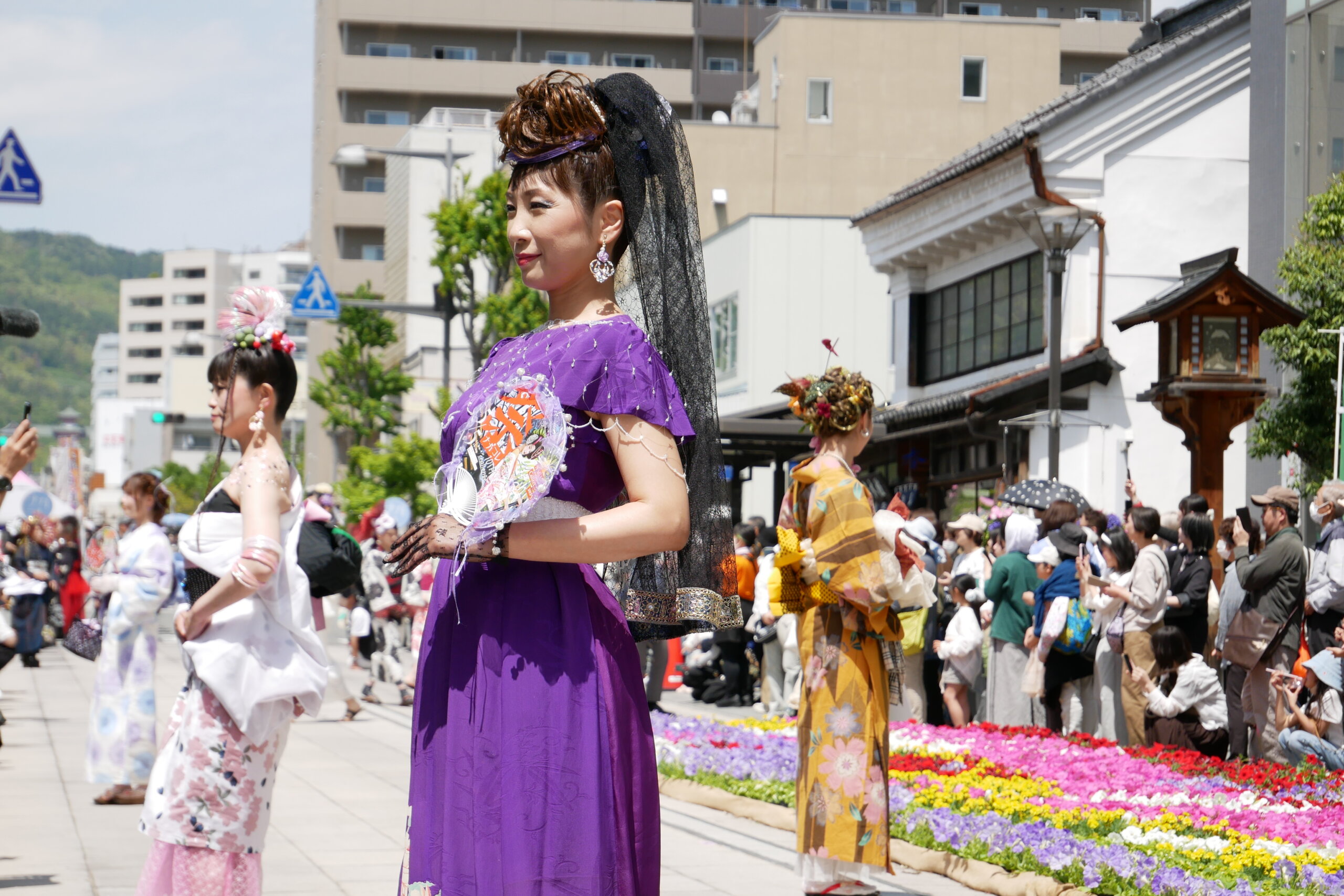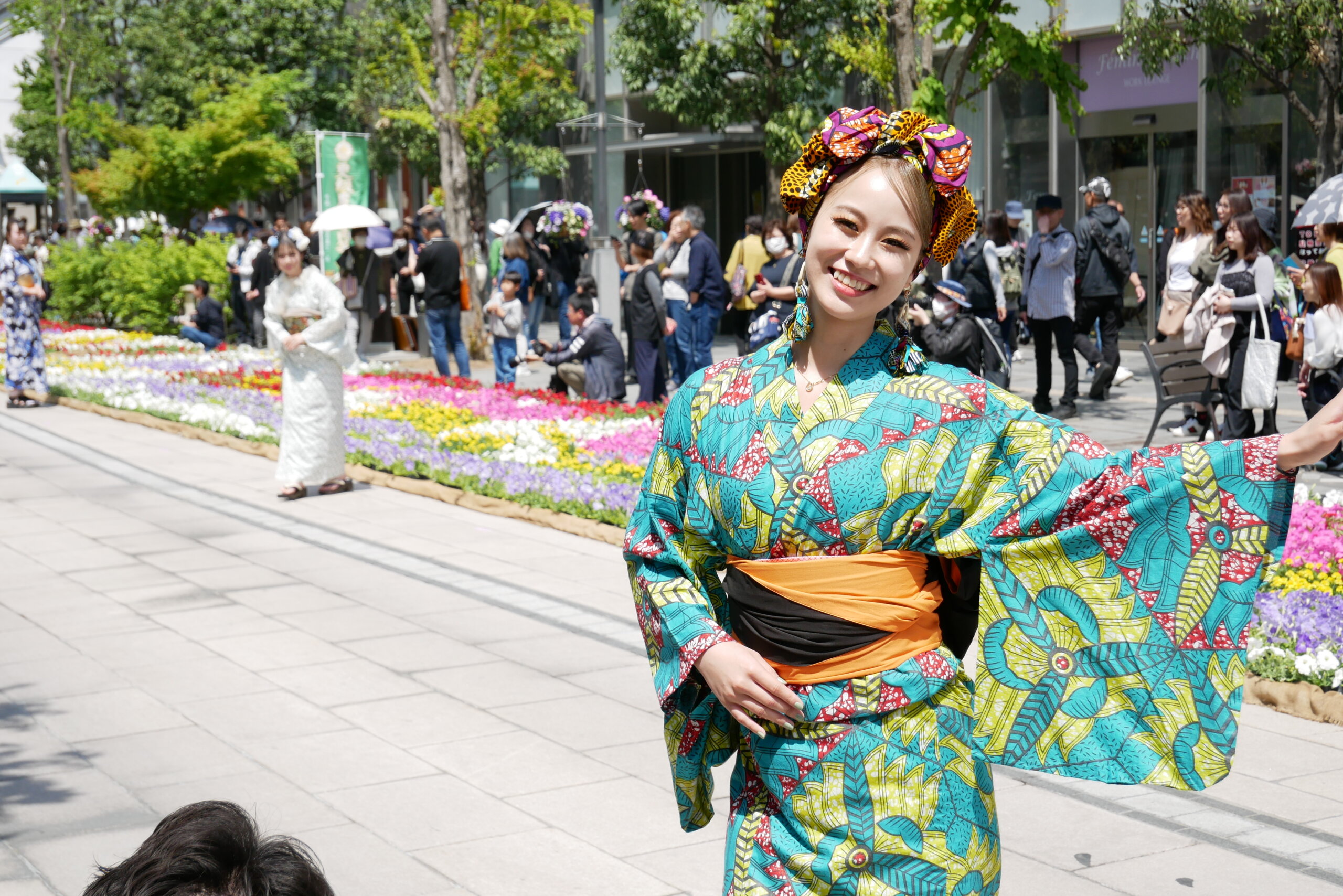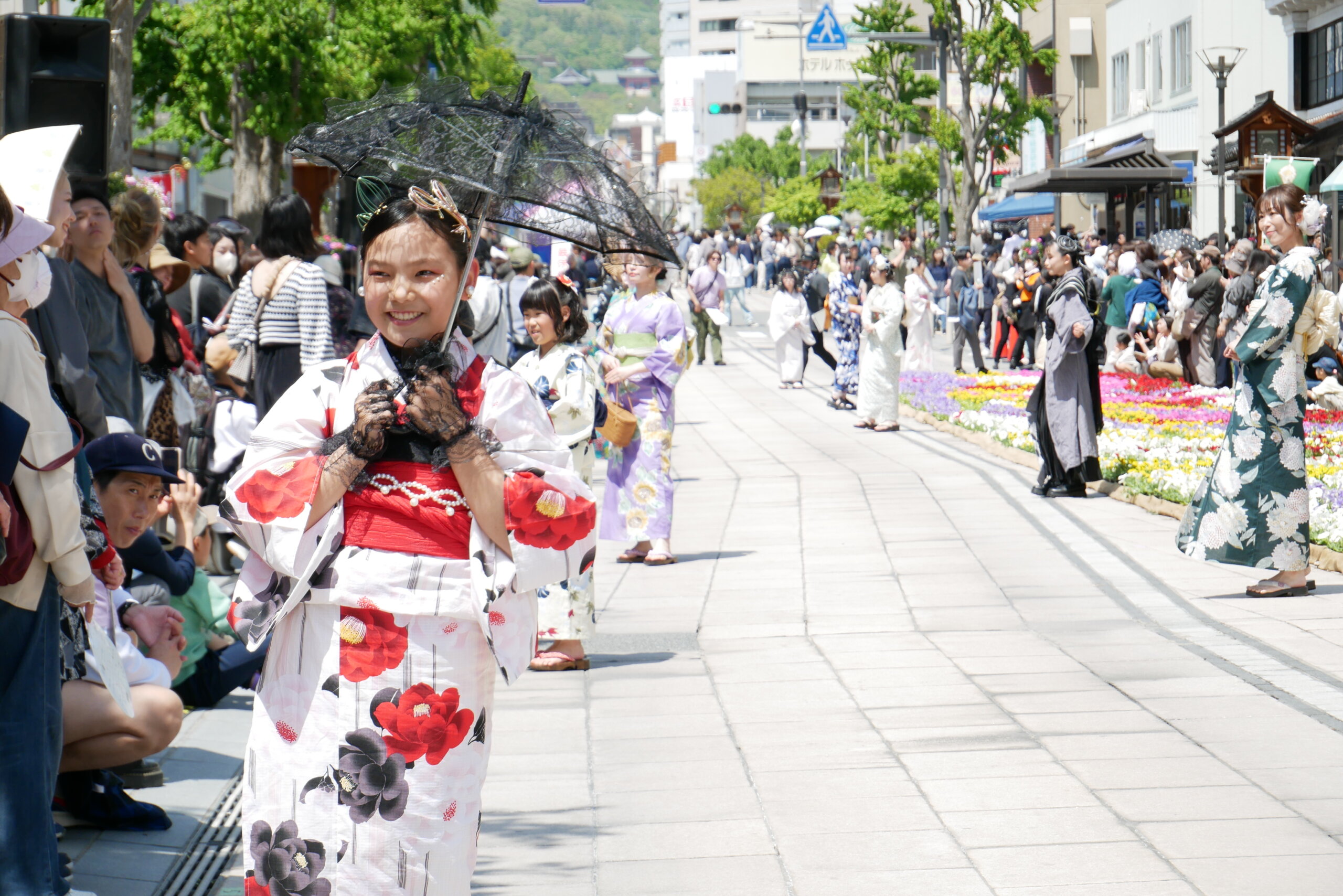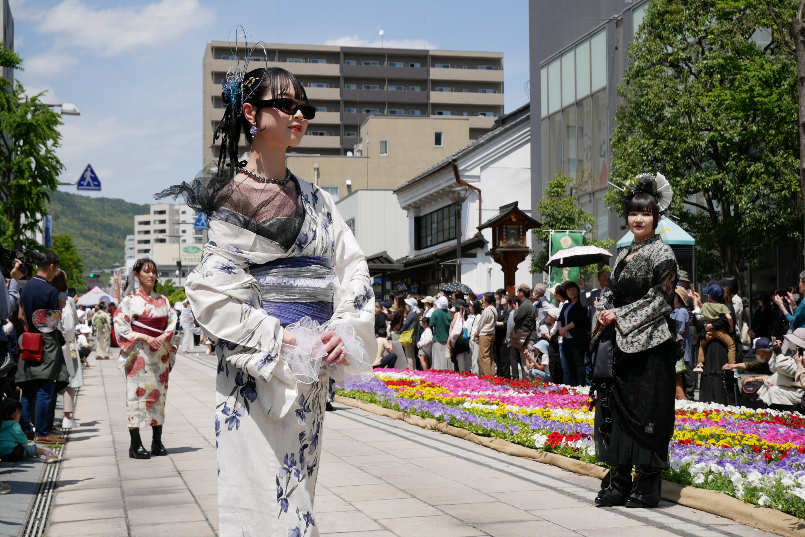 浴衣を着たモデルの皆さんが、善光寺表参道に一斉に並び、