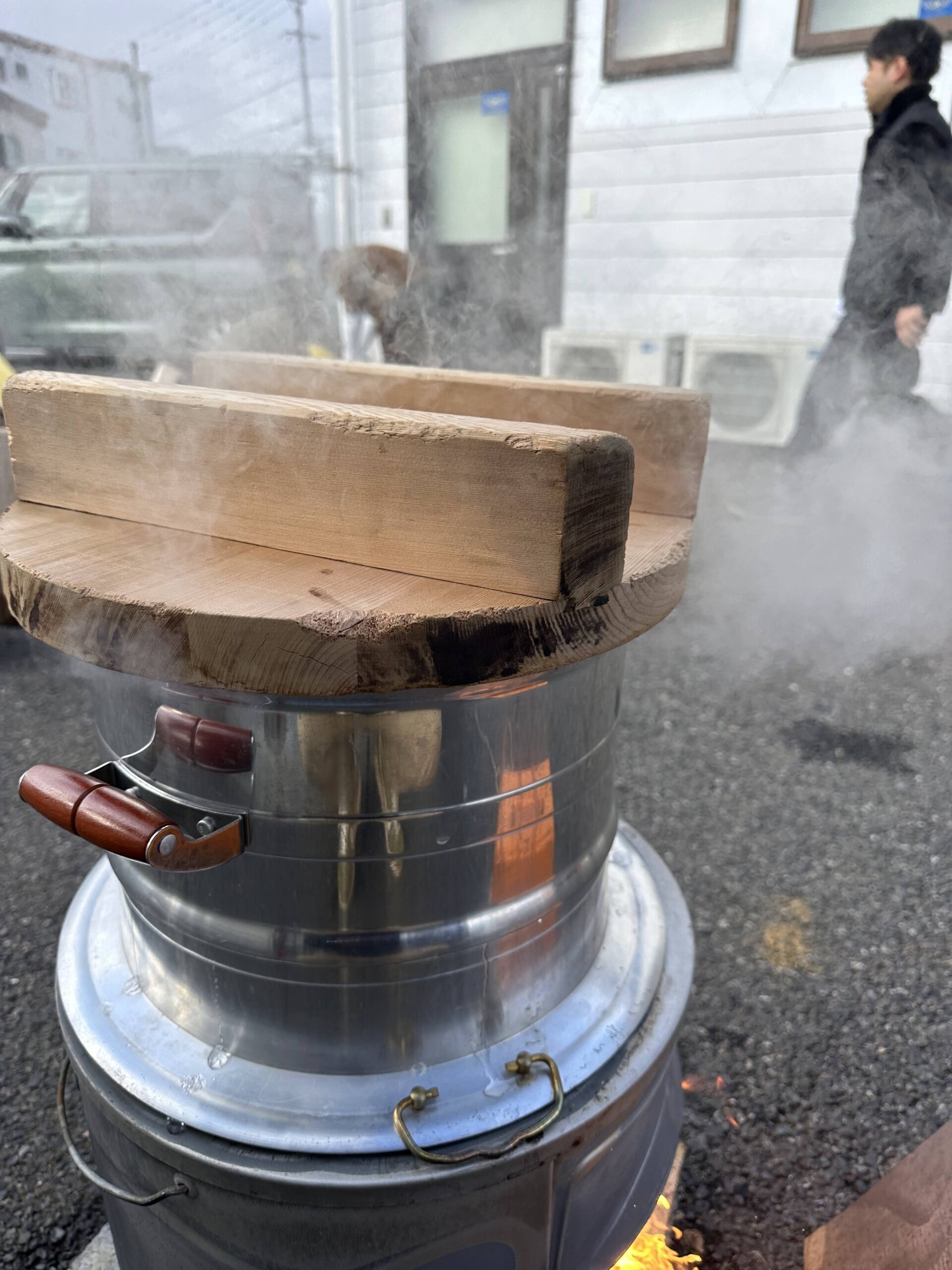 今回は松本支店で開催させてもらいました。サンプロスタッフのご実家から臼と杵をお借りして、普段は参加できない勤務の方々も加わって賑やかでしたよ。つきたてのお餅は格別な味わいです。