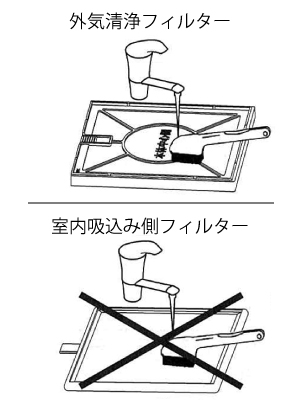 フィルター・ネットについた汚れを掃除機で吸い取ります。 汚れがひどい場合には、水洗いを行い、洗浄後は陰干ししてよく乾かしましょう。 ※ 外気温度が0℃以下の場合、凍結及び結露の原因になるため水洗いは行わないでください。 ※ 別売品のフィルターをご使用の方は、製造元のローヤル電機株式会社様のお手入れ方法をご確認ください。